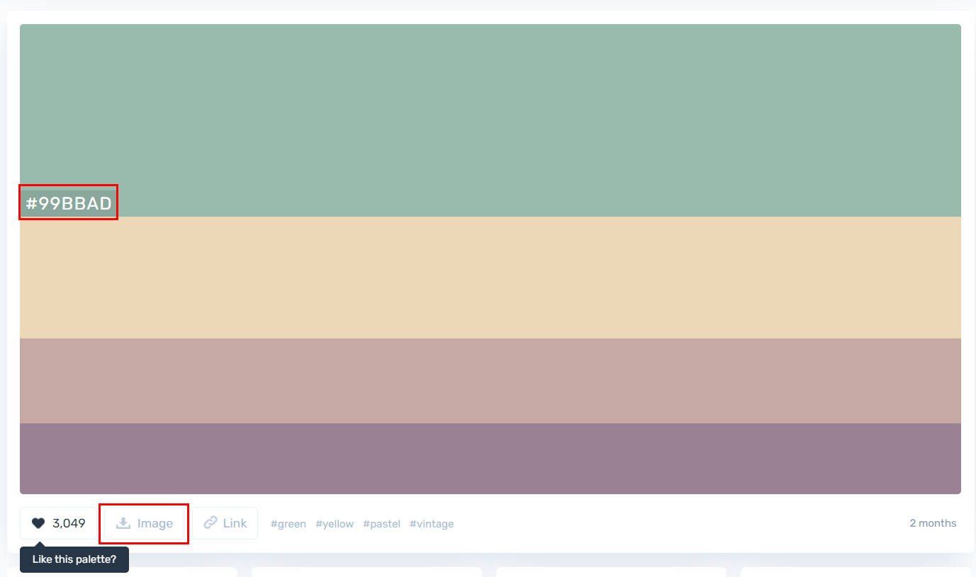 팔레트 필터를 통해 정렬을 할 수 있어 인기 있는 팔레트 조합도 빠르게 확인할 수 있습니다. 커서를 올리면 컬러 값도 바로 볼 수 있고, 원하는 컬러칩을 다운로드해서 쉽게 저장할 수 있습니다. 컬러칩을 저장하고나면 그림판이나 PPT 스포이트 기능을 통해 색상을 추출할 수 있기 때문에 매우 유용합니다.