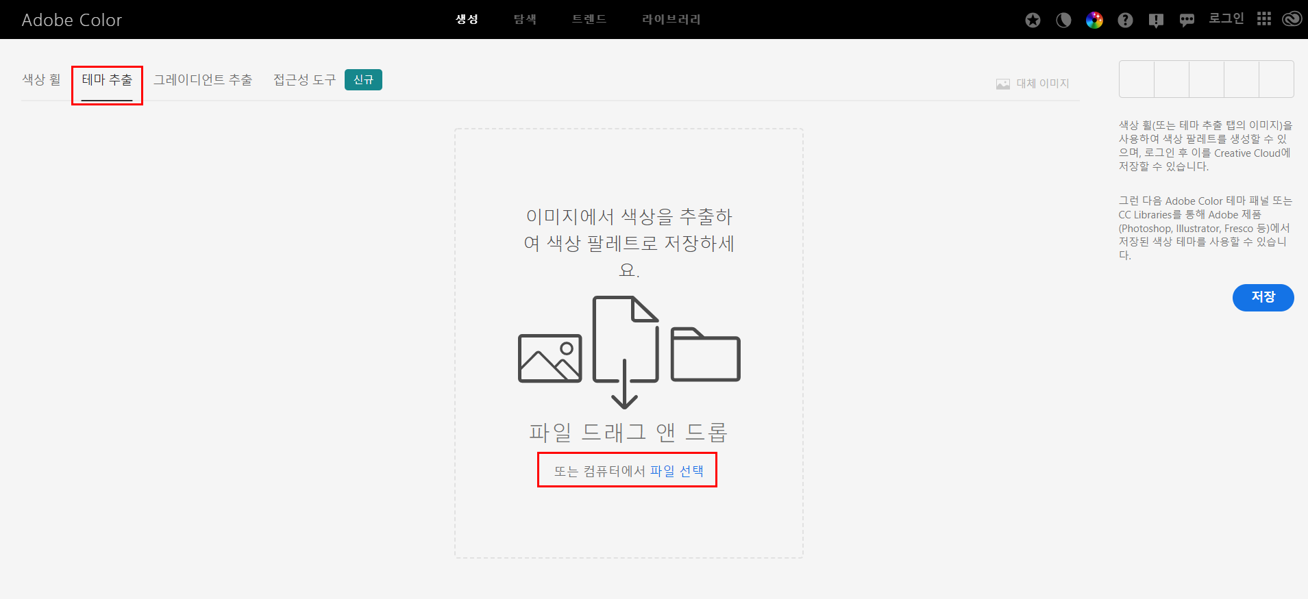 어도비 컬러에서 초보에게 유용한 기능은 '테마 추출'과 '탐색'입니다.