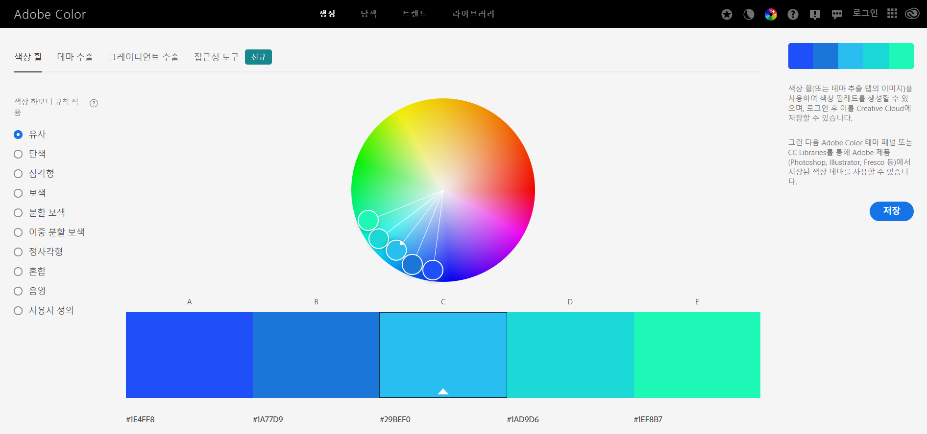 예전에는 어도비 쿨러라고 불렀는데 UI/UX가 더 정돈되고 어도비 컬러로 명칭이 바뀌었습니다. 제가 자주 애용하고 있는 사이트입니다. 기능들이 다른 사이트보다 더 다양한 게 장점이자 단점입니다. 처음 사용할 때는 복잡하다고 느낄 수도 있을 것 같습니다.